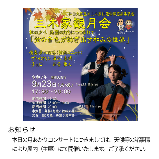 三木家観月会月あかりコンサート会場変更のお知らせ 多くの方より、三木家観月会についてお問い合わせをいただきありがとうございます。 本日の月あかりコンサートにつきしては、天候等の諸事情により屋内(主屋)にて開催いたします。ご了承ください。 時間等につきましては変更はありません。お時間の限りゆっくりお楽しみください。 ツイート