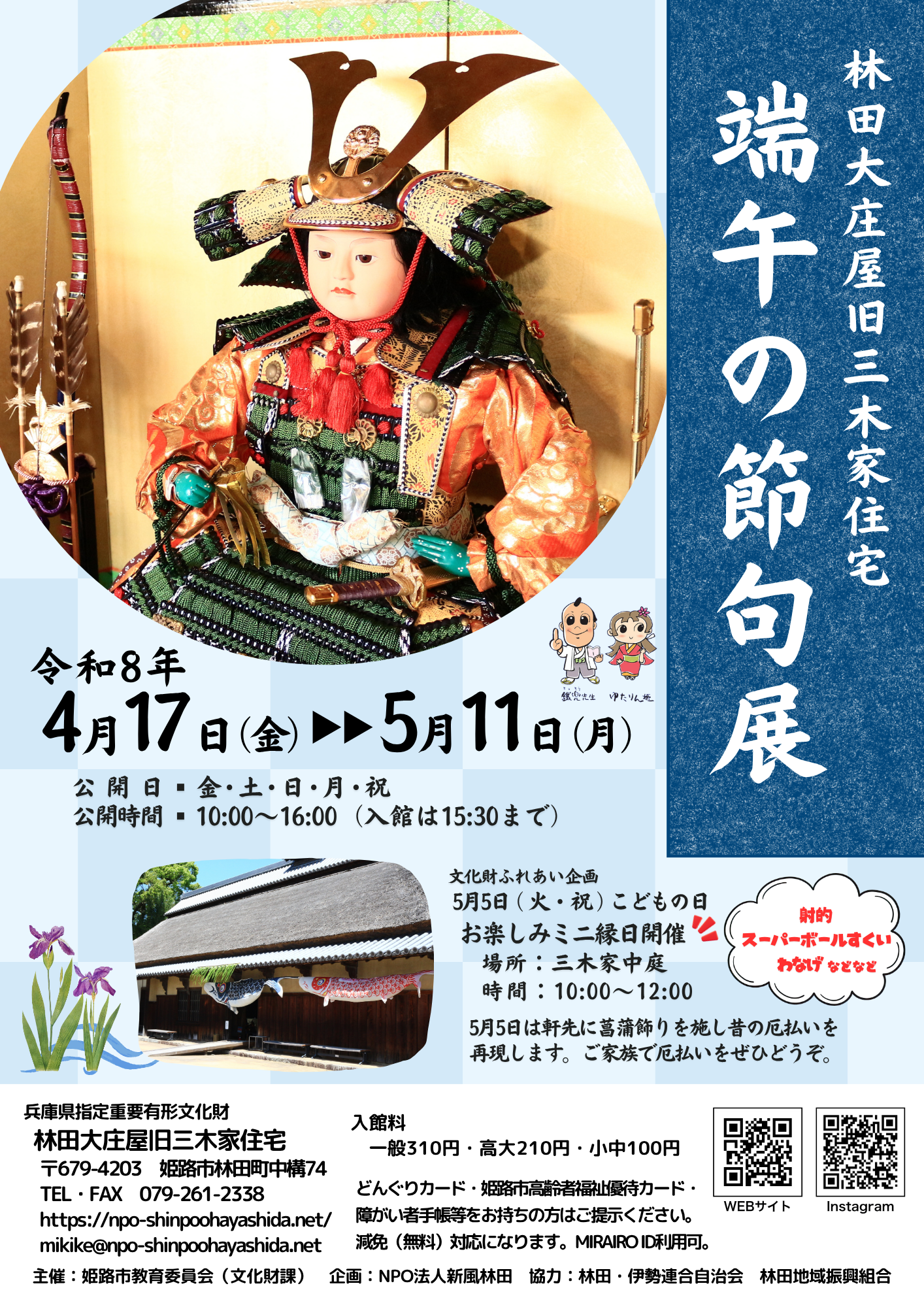 季節行事を開催している三木家でも、端午の節句展を開催します。五月人形や兜、勇者が描かれた武者のぼりを展示します。どうぞお越し下さい。